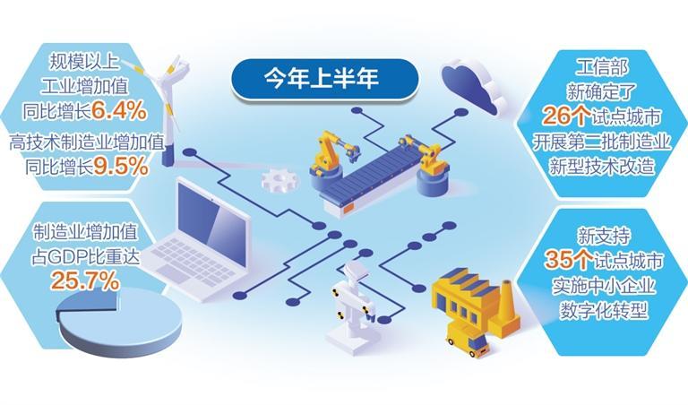 上半年,數(shù)字化轉(zhuǎn)型加速推進(jìn)。工信部新確定了26個(gè)試點(diǎn)城市開展第二批制造業(yè)新型技術(shù)改造,新支持35個(gè)試點(diǎn)城市實(shí)施中小企業(yè)數(shù)字化轉(zhuǎn)型。在電子信息、電力裝備、輕工、石化化工、鋼鐵、有色金屬、建材等行業(yè),加快推進(jìn)數(shù)字化轉(zhuǎn)型行動(dòng)。